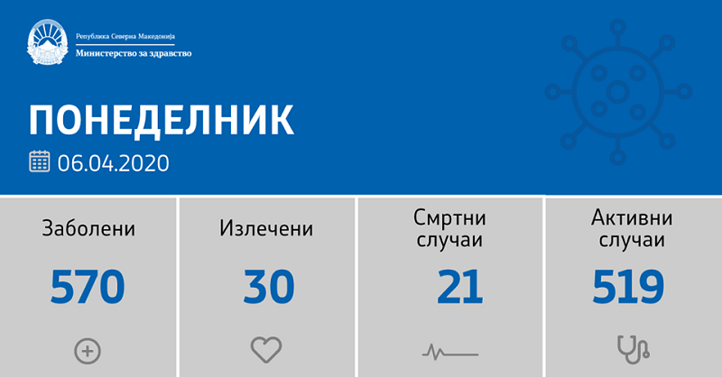 Четворица оздравени пациенти од Ковид-19 денеска си одат дома, а во последните 24 часа регистрирани се 15 нови случаи, драстично помалку од вчера кога беа регистрирани 72 нови заразени. Новите случаи на коронавирус по градови се: Скопје – 4, Куманово – 8, Тетово – 1, Струга – 1 и Штип – 1. Со ова, вкупната бројка на дијагностицирани пациенти со Ковид-19 денеска изнесува 570 лица.