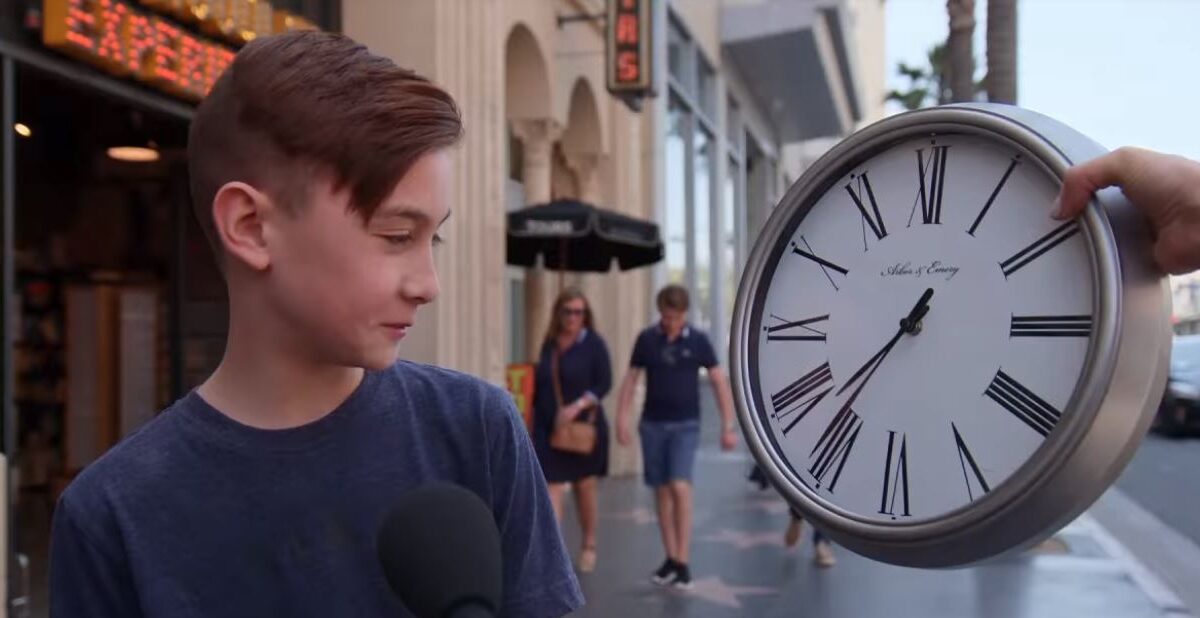 Откако британските медиуми објавија дека во тамошните училишта масовно се отстрануваат аналогните часовници бидејќи учениците знаат да читаат само дигитални, познатиот американски водител Џими Кимел реши да ја испита ситуацијата во Америка. Неговата екипа излезе на терен со аналоген часовник и праша неколку деца колку е часот.