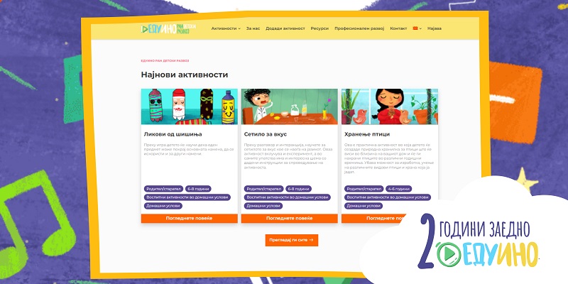 Поттикнувајќи го правилниот ран детски развој и учењето преку игра, во декември 2021 успеавме да ја пуштиме во употреба новата платформа – ЕДУИНО Ран детски развој, која нуди отворени, бесплатни и проверени ресурси и игровни активности наменети за воспитувачи, одделенски наставници и родители – ни раскажа Милена.