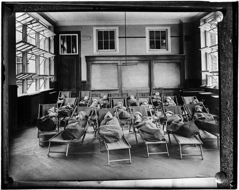 Првото училиште од овој тип е „отворено“ во јануари 1908 година и примало деца за кои се знаело дека биле во контакт со туберкулоза, но без изразени симптоми. Училниците имале многу прозорци, некои од нив и од сите 3 страни, а сите биле отворени цело време, иако била зима. И тоа многу студена зима. Децата, баш во студените денови, носеле таканаречени ескимски вреќи за седење во кои се ставале топли камења за да им се греат стапалата. Учителката Мери Пауерс, покрај тоа што го предавала материјалот, им подгревала супа и пудинг на децата.