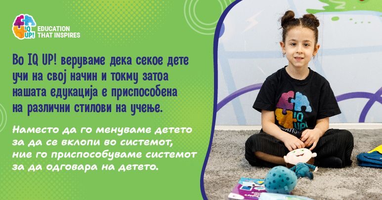 Во IQ UP! детето е во фокусот. Наставата е приспособена на различни стилови на учење – визуелни, аудитивни, кинестетички – и комбинира современи педагошки методи, интерактивни активности и практични проекти.