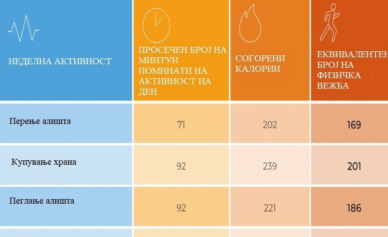 Најмалку интензивна активност било перење алишта, каде што просечното време поминато за чистење на алиштата било 71 минута, при што се согоруваат 202 калории.