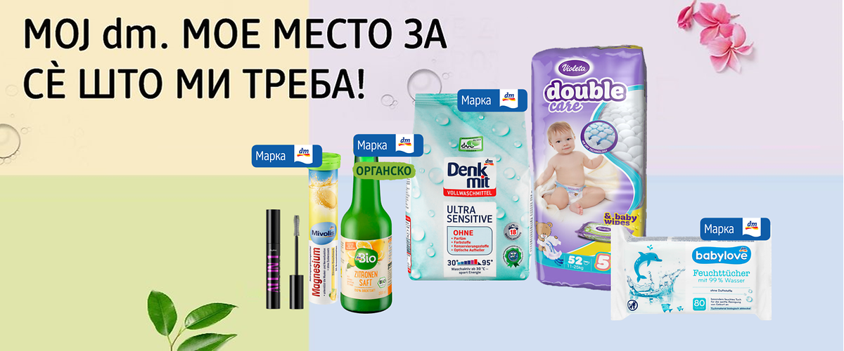 Дрогериите на dm во нашата земја се совршеното место за one-stop-shopping. Со својот асортиман од повеќе од 14.500 производи за нега и убавина, органска храна и додатоци, сѐ за вашето бебе, па сѐ до производи за вашиот дом и нега на вашите алишта, dm има навистина сѐ што ви треба за вас и вашето семејство.