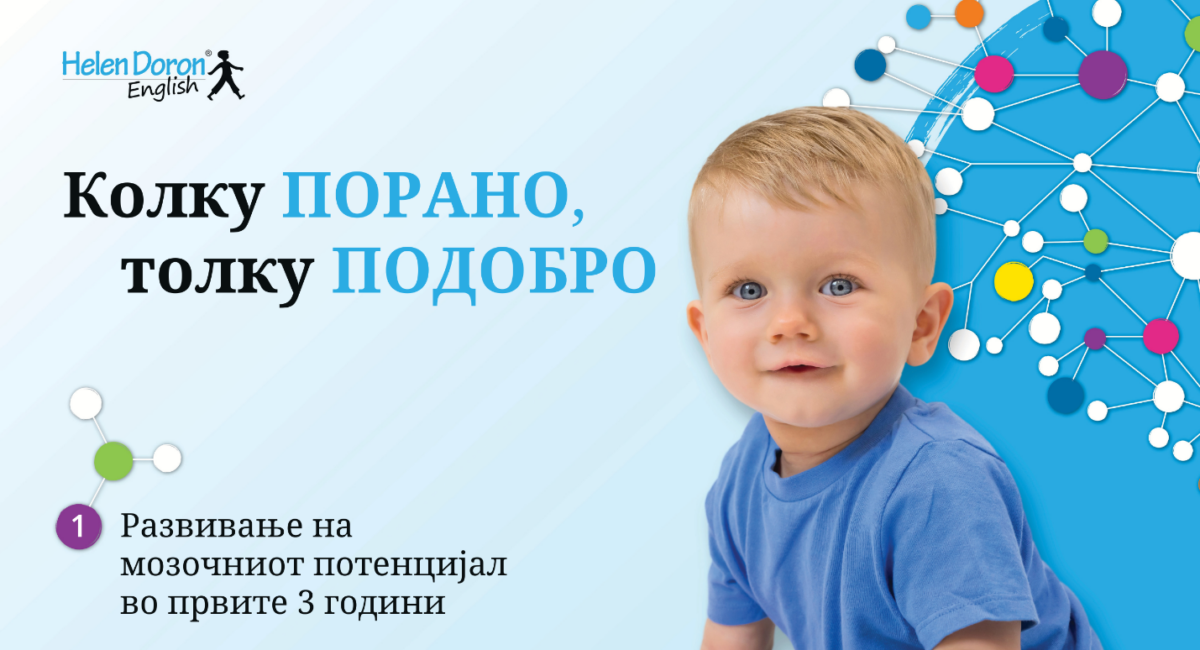 Токму затоа Helen Doron English методологијата има специјални програми за деца од 1 до 3 години – кога мозокот е најподготвен за јазично учење. Преку песни, игри, движења, музика, ритам и постојана изложеност на англиски јазик, децата го впиваат англискиот природно, исто како мајчин јазик.