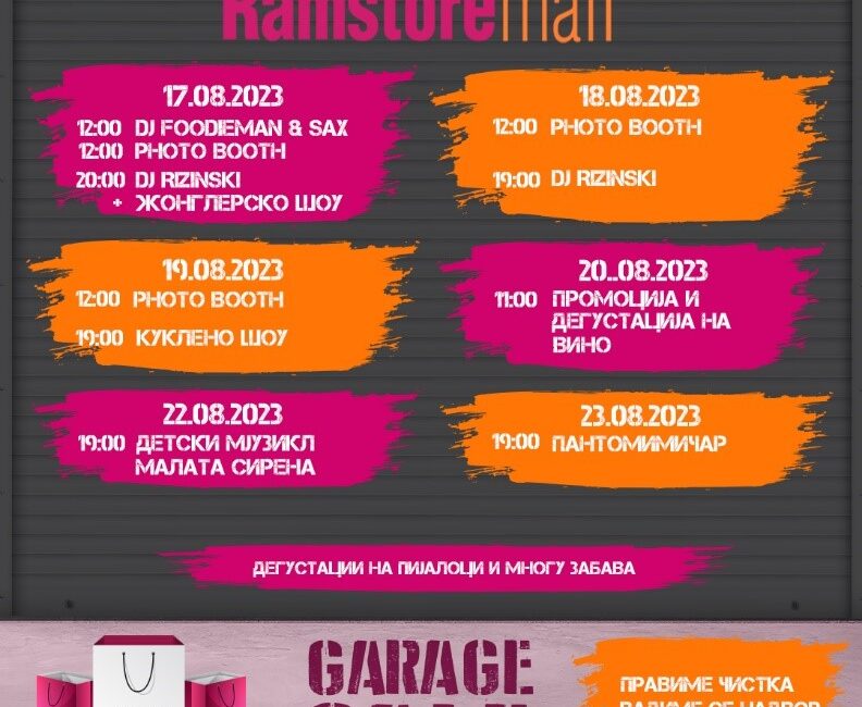 Покрај големите попусти, посетителите на „Рамстор мол“ ќе можат да уживаат во богатата програма, специјално организирана за овој настан, која содржи многу музика во придружба на добро познатите DJ FOODIMAN & SAX, кои свечено ќе го одбележат стартот на најголемата распродажба во градот – Garage Sale.