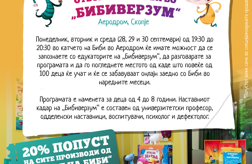 Понеделник, вторник и среда (28, 29 и 30 септември) од 19:30 до 20:30 во катчето на Биби во Аеродром ќе имате можност да се запознаете со едукаторите на „Бибиверзум“, да разговарате за програмата и да го погледнете местото од каде што повеќе од 100 деца ќе учат и ќе се забавуваат онлајн заедно со Биби во наредните месеци.