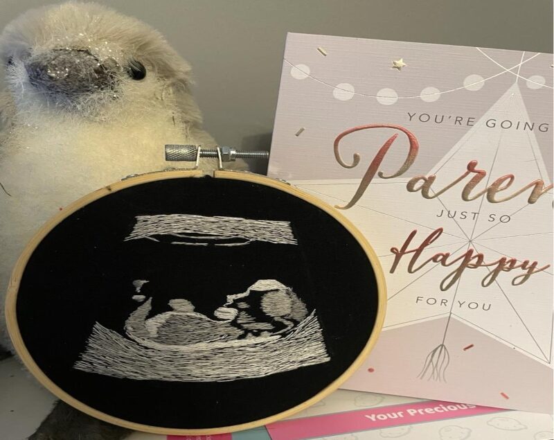 Received this amazing surprise today… it’s an embroided tactile version of our 12 week baby scan, so for the first time as a blind dad to be, I’m able to build a picture of our baby scan through touch ❤️