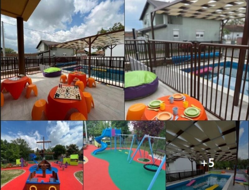 Имено, градинката е полна со секакви содржини за децата, па дури има и базен.