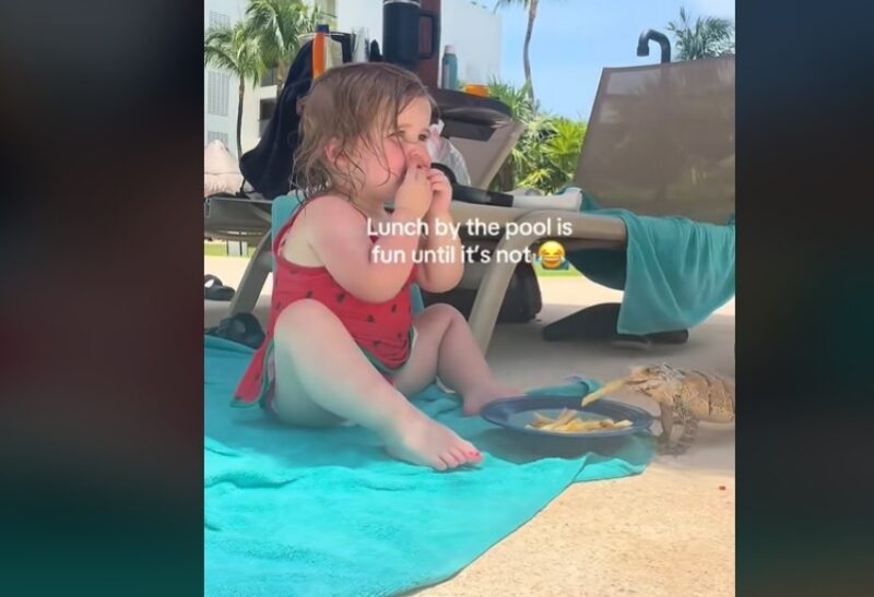Видеото првично прикажува идилична сцена: девојче кое мирно ужива во јадењето помфрит покрај базенот по пливањето. Но, мирот трае само додека не се појавува гуштер во кадарот со брзина на молња. Изненадувачкиот гостин имал само една цел: нејзиниот ручек.