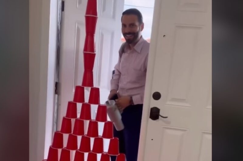 Во видеото што ќе го видите во продолжение двете деца наредиле пластични чаши пред влезната врата од домот, за кога ќе се врати од работа нивниот татко, да ја отвори вратата и да ги сруши чашите. Сепак, таткото се враќа порано од работа и ја гледа „замката“ која му ја поставиле децата, а истовремено го пречекува и неговата сопруга. Заедно се договараат дека таткото ќе се однесува како да не знае и нема да им го расипе ќефот на дечињата.