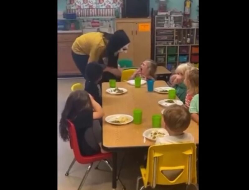 На видеото, објавено на „Редит“, можете да видите како воспитувачка со маска на лицето се приближува до група деца кои седат на масите и ручаат. Кога ја здогледува, малото момче почнува да вреска и да плаче. Децата се видно вознемирени, а некои трчаат и се обидуваат да се скријат под масите и зад полиците за книги. Во еден момент маскираната воспитувачка му се приближува на момчето и му вели: „Дали беше непослушен? Сакаш да те избркам надвор?“