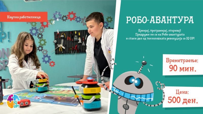 IQ UP! едукативната франшиза за СТЕМ-едукација за деца, позната по своите квалитетни образовни програми, организира научна работилница под наслов „Робо-авантура“, наменета за деца од 5 до 9 години со цел да ги воведе во возбудливиот свет на роботиката и науката.